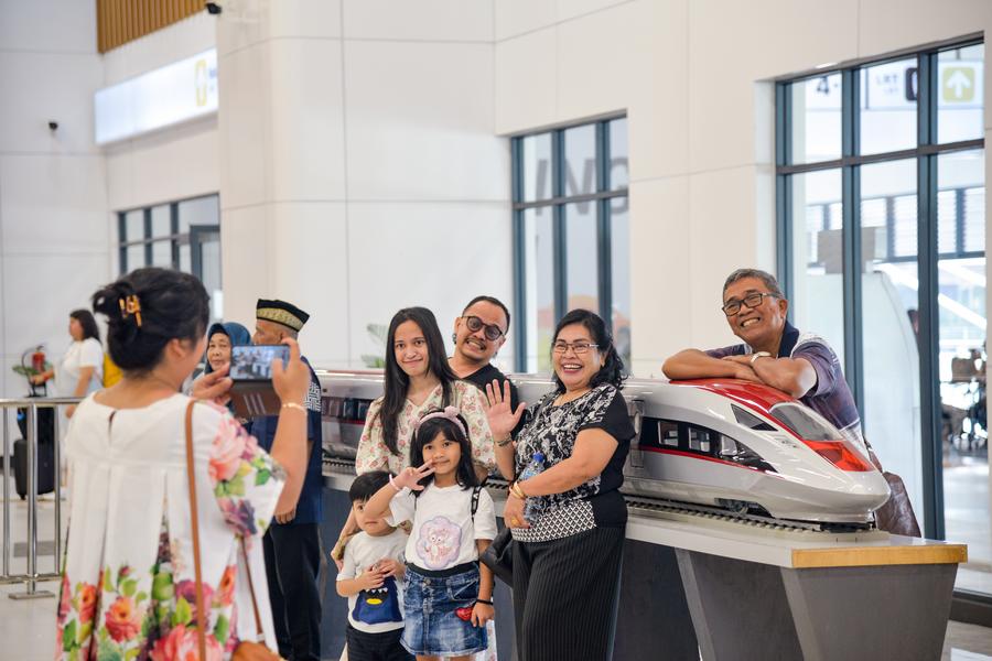 Passengers pose for photos with a model of a high-speed electrical multiple unit (EMU) train of the Jakarta-Bandung high-speed railway at the waiting hall of Halim Station in Jakarta, Indonesia, Jun. 17, 2024. (Photo/Xinhua)