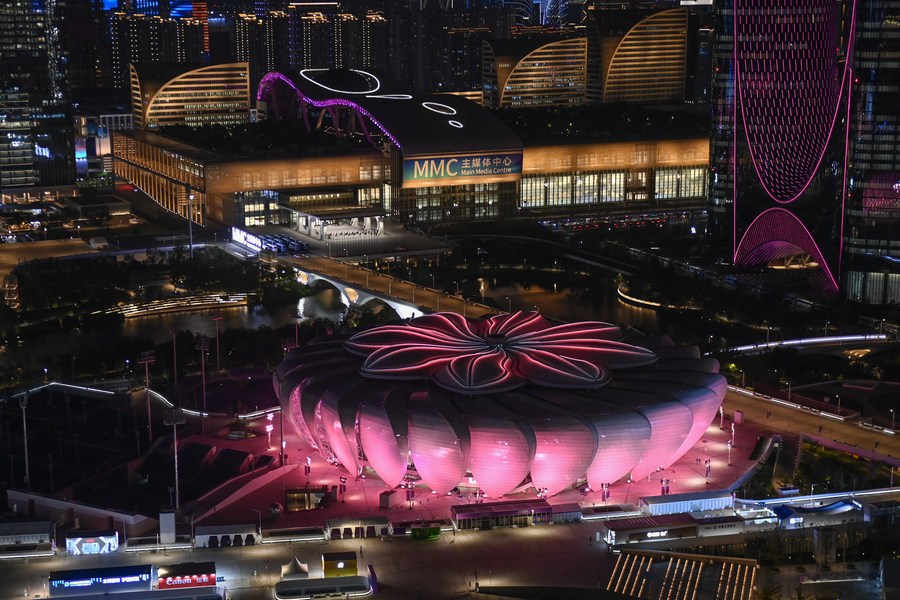 This aerial photo taken on Sept. 9, 2023 shows the Hangzhou Olympic Sports Center’s Tennis Center in Hangzhou, east China’s Zhejiang Province. (Photo/Xinhua)