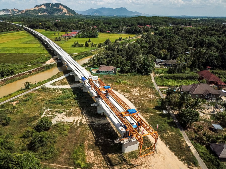 This aerial photo taken on Apr. 26, 2023 shows a construction site of the East Coast Rail Link (ECRL), a major infrastructure project under the Belt and Road Initiative (BRI) in Kelantan, Malaysia. (Photo/Xinhua)